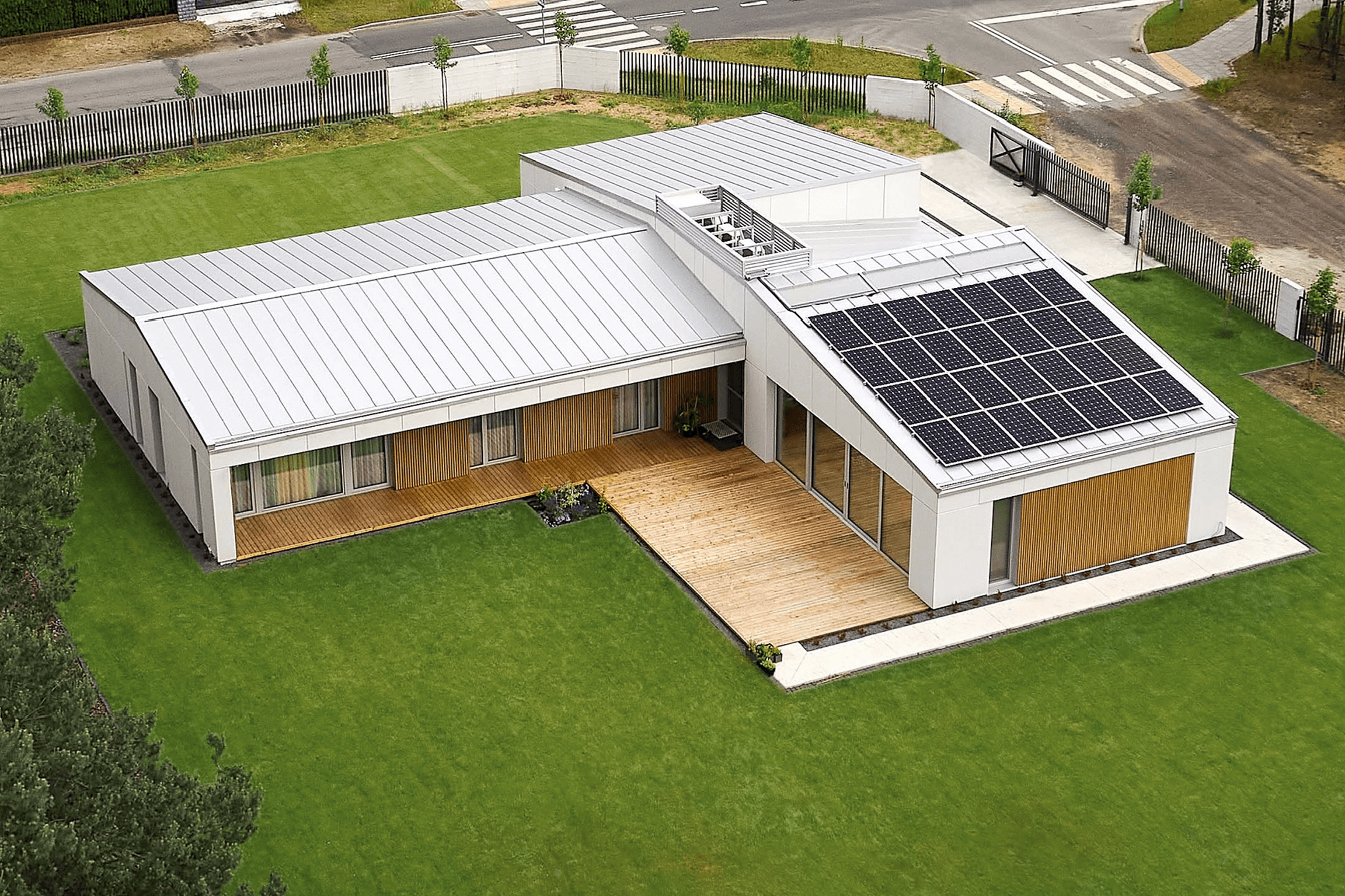 The single-story, L-shaped building integrates seamlessly into its